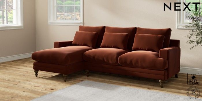 6.12.1 Buy Hutton Deep Relaxed Sit Medium Sofa Chaise - Left Hand Plush Velvet Easy Clean Ginger Orange Country Turned - Mid from the Next UK online shop Click here to use our accessible website
