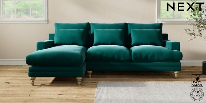 7.0.3 Buy Hutton Deep Relaxed Sit Medium Sofa Chaise - Left Hand Plush Velvet Easy Clean Juniper Green Country Turned - Light from the Next UK online shop Click here to use our accessible website