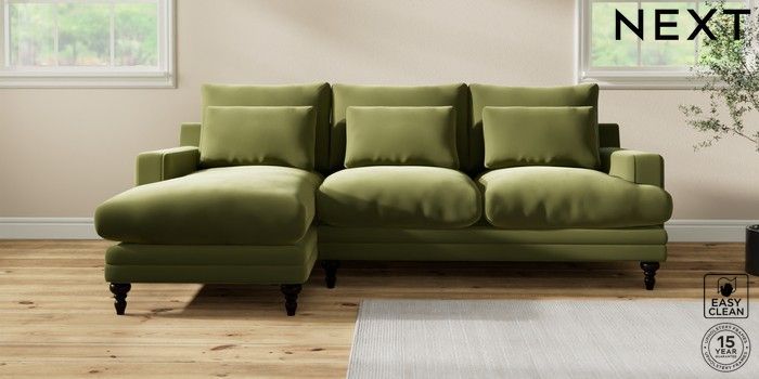 7.0.3 Buy Hutton Deep Relaxed Sit Medium Sofa Chaise - Left Hand Plush Velvet Easy Clean Mid Olive Green Country Turned - Dark from the Next UK online shop Click here to use our accessible website