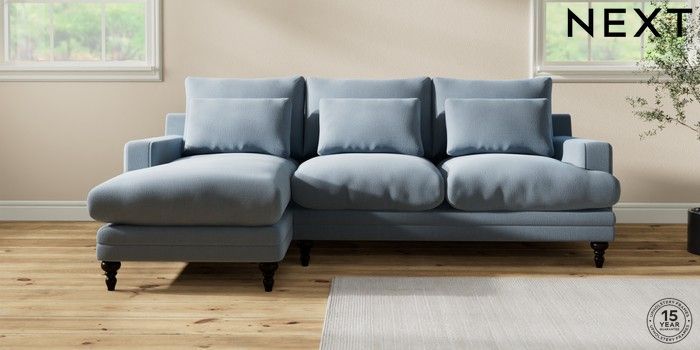 7.0.3 Buy Hutton Deep Relaxed Sit Medium Sofa Chaise - Left Hand Relaxed Linen Look Mid Blue Country Turned - Dark from the Next UK online shop Click here to use our accessible website