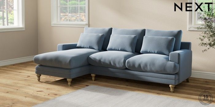 6.12.1 Buy Hutton Deep Relaxed Sit Medium Sofa Chaise - Left Hand Relaxed Linen Look Mid Blue Country Turned - Light from the Next UK online shop Click here to use our accessible website
