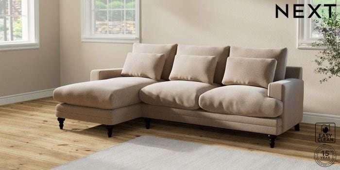 6.12.1 Buy Hutton Deep Relaxed Sit Medium Sofa Chaise - Left Hand Tweedy Blend Easy Clean Light Dove Natural Country Turned - Dark from the Next UK online shop Click here to use our accessible website