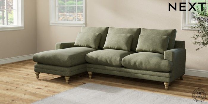 6.12.1 Buy Hutton Deep Relaxed Sit Medium Sofa Chaise - Left Hand Tweedy Chenille Mid Moss Green Country Turned - Light from the Next UK online shop Click here to use our accessible website