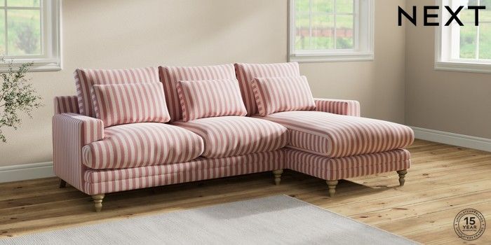 6.12.1 Buy Hutton Deep Relaxed Sit Medium Sofa Chaise - Right Hand Bold Chenille Stripe Dark Pink Country Turned - Light from the Next UK online shop Click here to use our accessible website