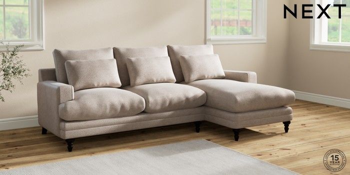 6.12.1 Buy Hutton Deep Relaxed Sit Medium Sofa Chaise - Right Hand Boucle Chenille Light Natural Country Turned - Dark from the Next UK online shop Click here to use our accessible website