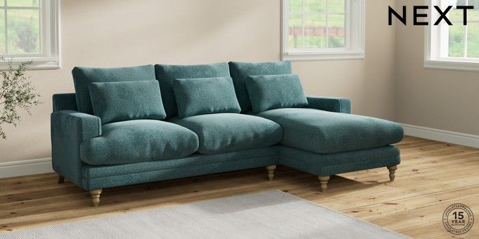 6.12.1 Buy Hutton Deep Relaxed Sit Medium Sofa Chaise - Right Hand Chunky Chenille Mid Teal Green Country Turned - Light from the Next UK online shop Click here to use our accessible website