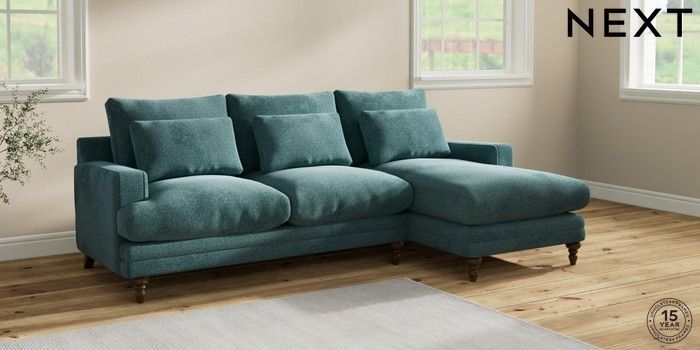 6.12.1 Buy Hutton Deep Relaxed Sit Medium Sofa Chaise - Right Hand Chunky Chenille Mid Teal Green Country Turned - Mid from the Next UK online shop Click here to use our accessible website