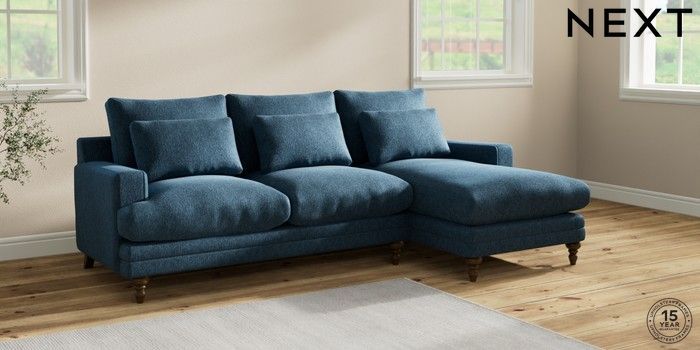 6.12.1 Buy Hutton Deep Relaxed Sit Medium Sofa Chaise - Right Hand Cotswold Chenille Dark Blue Country Turned - Mid from the Next UK online shop Click here to use our accessible website