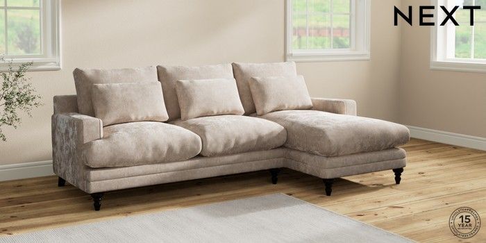 6.12.1 Buy Hutton Deep Relaxed Sit Medium Sofa Chaise - Right Hand Distressed Velour Mid Natural Country Turned - Dark from the Next UK online shop Click here to use our accessible website
