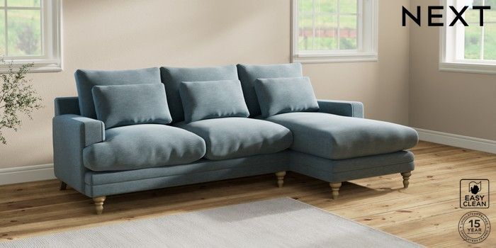 6.12.1 Buy Hutton Deep Relaxed Sit Medium Sofa Chaise - Right Hand Fine Chenille Easy Clean Mid Blue Country Turned - Light from the Next UK online shop Click here to use our accessible website