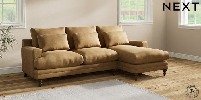 6.12.1 Buy Hutton Deep Relaxed Sit Medium Sofa Chaise - Right Hand Luxe Chenille Honey Yellow Country Turned - Mid from the Next UK online shop Click here to use our accessible website