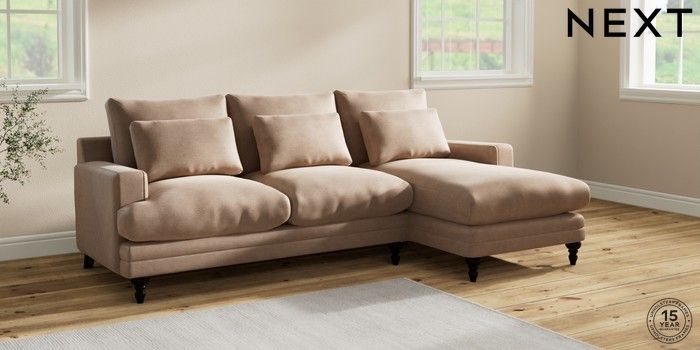 6.12.1 Buy Hutton Deep Relaxed Sit Medium Sofa Chaise - Right Hand Luxe Chenille Mid Natural Country Turned - Dark from the Next UK online shop Click here to use our accessible website
