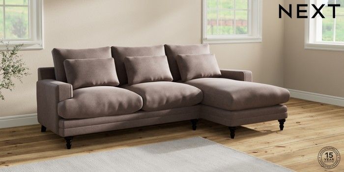 6.12.1 Buy Hutton Deep Relaxed Sit Medium Sofa Chaise - Right Hand Luxe Chenille Mink Brown Country Turned - Dark from the Next UK online shop Click here to use our accessible website