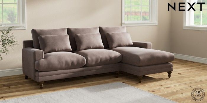 6.12.1 Buy Hutton Deep Relaxed Sit Medium Sofa Chaise - Right Hand Luxe Chenille Mink Brown Country Turned - Mid from the Next UK online shop Click here to use our accessible website