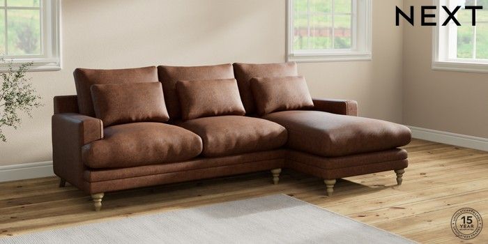 6.12.1 Buy Hutton Deep Relaxed Sit Medium Sofa Chaise - Right Hand Monza Faux Leather Easy Clean Chestnut Brown Country Turned - Light from the Next UK online shop Click here to use our accessible website