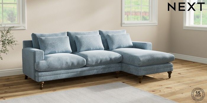 7.2.6 Buy Hutton Deep Relaxed Sit Medium Sofa Chaise - Right Hand Plush Chenille Light Blue Country Turned - Mid from the Next UK online shop Click here to use our accessible website