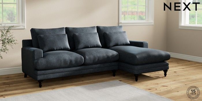 6.12.1 Buy Hutton Deep Relaxed Sit Medium Sofa Chaise - Right Hand Plush Chenille Slate Blue Country Turned - Dark from the Next UK online shop Click here to use our accessible website