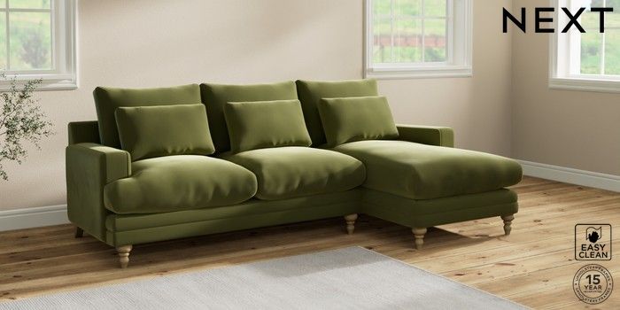 6.12.1 Buy Hutton Deep Relaxed Sit Medium Sofa Chaise - Right Hand Plush Velvet Easy Clean Mid Olive Green Country Turned - Light from the Next UK online shop Click here to use our accessible website