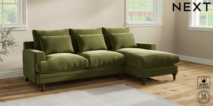6.12.1 Buy Hutton Deep Relaxed Sit Medium Sofa Chaise - Right Hand Plush Velvet Easy Clean Mid Olive Green Country Turned - Mid from the Next UK online shop Click here to use our accessible website