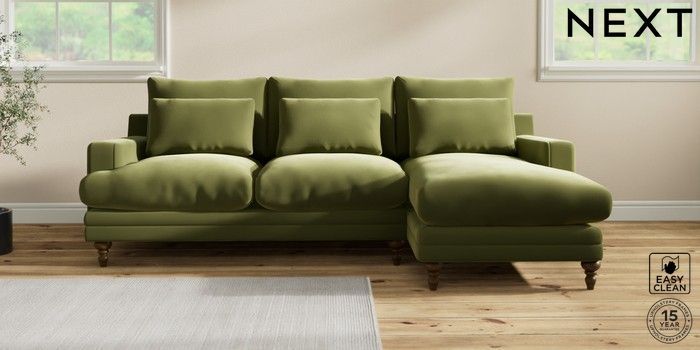 7.0.3 Buy Hutton Deep Relaxed Sit Medium Sofa Chaise - Right Hand Plush Velvet Easy Clean Mid Olive Green Country Turned - Mid from the Next UK online shop Click here to use our accessible website
