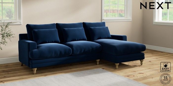 6.12.1 Buy Hutton Deep Relaxed Sit Medium Sofa Chaise - Right Hand Plush Velvet Easy Clean Navy Blue Country Turned - Light from the Next UK online shop Click here to use our accessible website