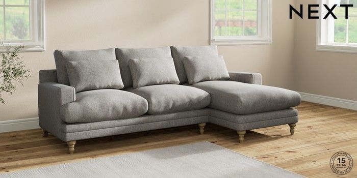 6.12.1 Buy Hutton Deep Relaxed Sit Medium Sofa Chaise - Right Hand Tweedy Chenille Mid Grey Country Turned - Light from the Next UK online shop Click here to use our accessible website