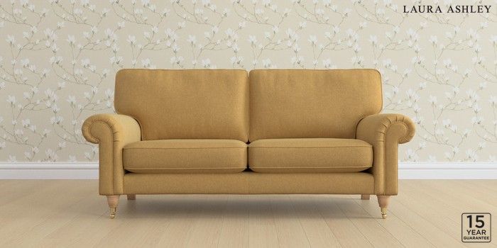 6.12.1 Buy Kingston by Laura Ashley 3 Seater Small Sofa Peyton Ochre Yellow Low Brass Castor - Light Oak from the Next UK online shop Click here to use our accessible website