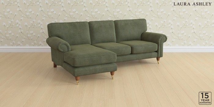 6.12.1 Buy Kingston by Laura Ashley Medium Sofa Chaise - Left Hand Edwin Chenille Hedgerow Green Low Brass Castor - Teak from the Next UK online shop Click here to use our accessible website