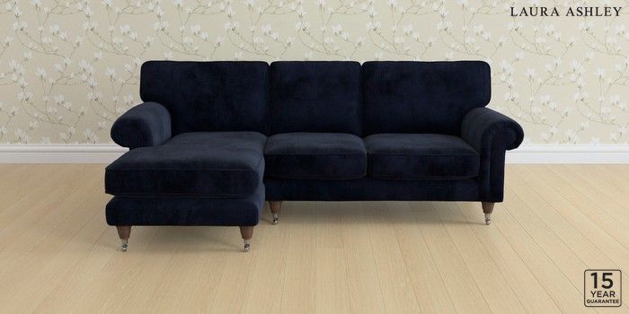 6.12.1 Buy Kingston by Laura Ashley Medium Sofa Chaise - Left Hand Orla Midnight Navy Low Chrome Castor - Chestnut from the Next UK online shop Click here to use our accessible website
