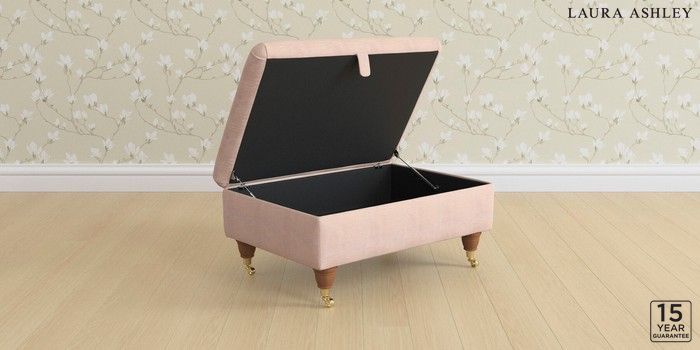 7.3.1 Buy Kingston by Laura Ashley Storage Footstool Edwin Chenille Blush Pink Low Brass Castor - Teak from the Next UK online shop Click here to use our accessible website