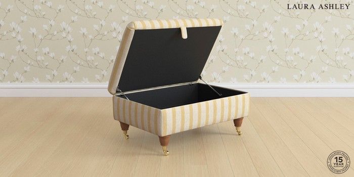 7.3.1 Buy Kingston by Laura Ashley Storage Footstool Kinsham Stripe Ochre Yellow Low Brass Castor - Teak from the Next UK online shop Click here to use our accessible website
