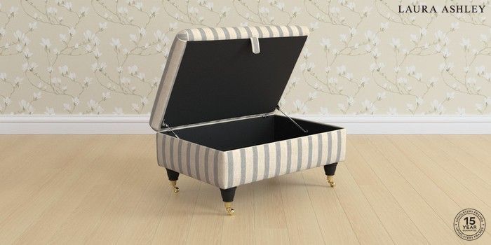 7.2.6 Buy Kingston by Laura Ashley Storage Footstool Kinsham Stripe Seaspray Blue Low Brass Castor - Black from the Next UK online shop Click here to use our accessible website