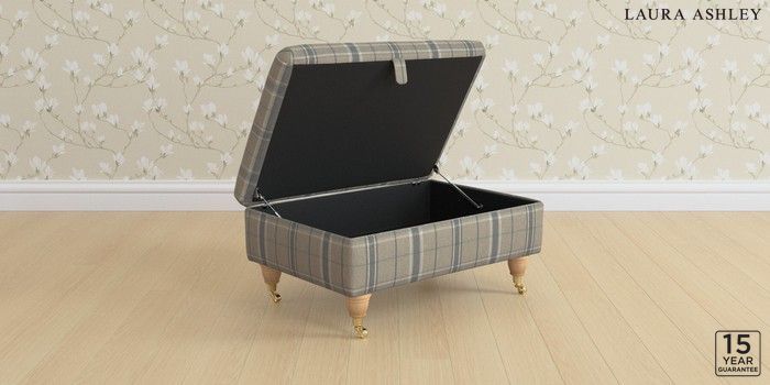 7.3.1 Buy Kingston by Laura Ashley Storage Footstool Longstowe Check French Grey Low Brass Castor - Light Oak from the Next UK online shop Click here to use our accessible website