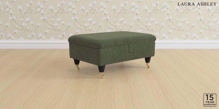 6.12.13 Buy Kingston by Laura Ashley Storage Footstool Lundar Chenille Ivy Green Low Brass Castor - Black from the Next UK online shop Click here to use our accessible website