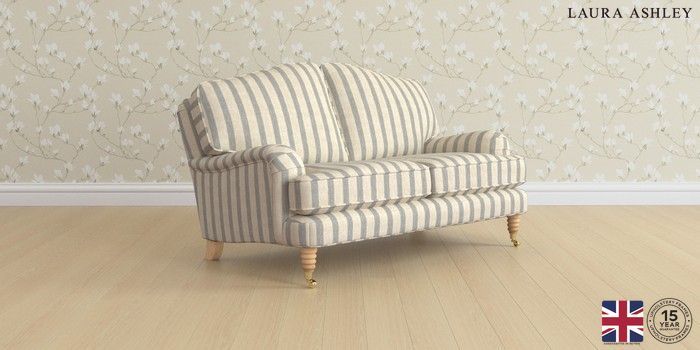 6.12.1 Buy Lynden by Laura Ashley 2 Seater Small Sofa Kinsham Stripe Seaspray Blue Ornate Brass Castor - Light Oak from the Next UK online shop Click here to use our accessible website