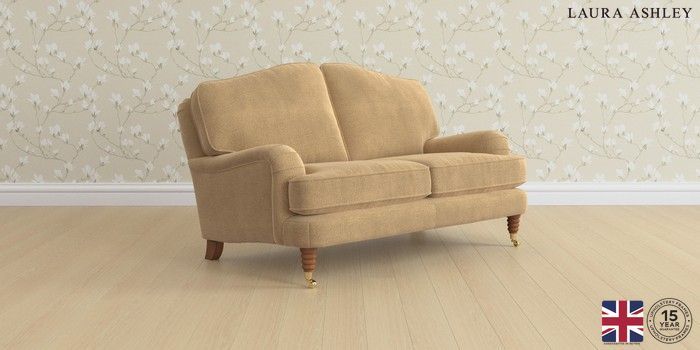 6.12.1 Buy Lynden by Laura Ashley 2 Seater Small Sofa Lundar Chenille Caramel Natural Ornate Brass Castor - Teak from the Next UK online shop Click here to use our accessible website