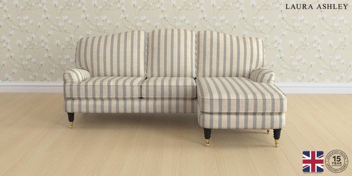 6.12.1 Buy Lynden by Laura Ashley Medium Sofa Chaise - Universal Kinsham Stripe Seaspray Blue Ornate Brass Castor - Black from the Next UK online shop Click here to use our accessible website