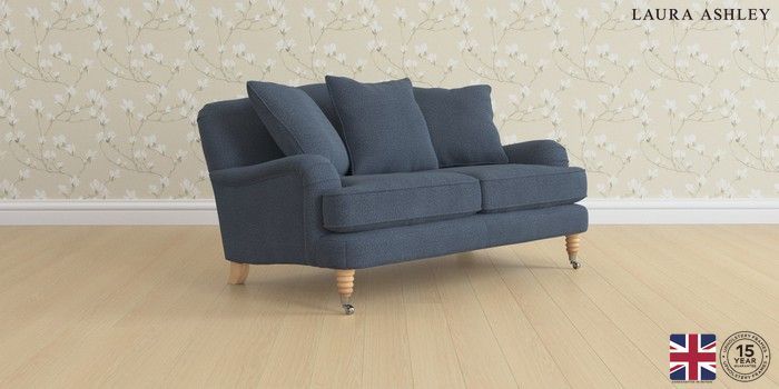 6.12.1 Buy Lynden Scatter Back by Laura Ashley 2 Seater Small Sofa Lundar Chenille Navy Blue Ornate Chrome Castor - Light Oak from the Next UK online shop Click here to use our accessible website