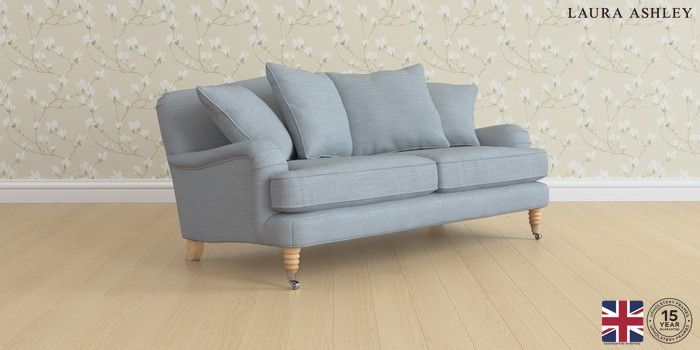 6.12.1 Buy Lynden Scatter Back by Laura Ashley 3 Seater Small Sofa Kinsham Seaspray Blue Ornate Chrome Castor - Light Oak from the Next UK online shop Click here to use our accessible website