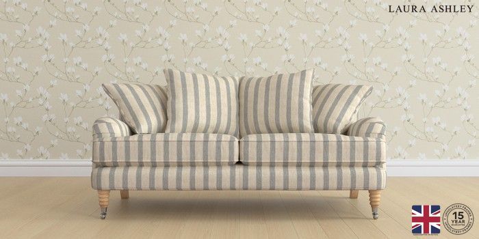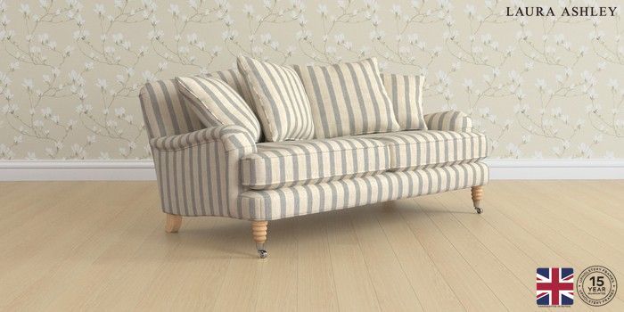 6.12.1 Buy Lynden Scatter Back by Laura Ashley 3 Seater Small Sofa Kinsham Stripe Seaspray Blue Ornate Chrome Castor - Light Oak from the Next UK online shop Click here to use our accessible website