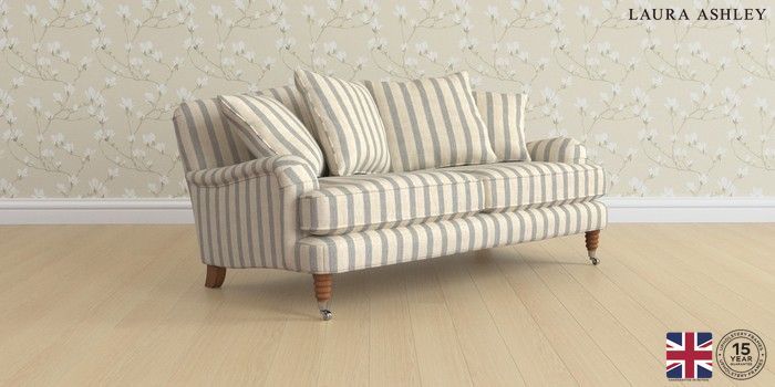 6.12.1 Buy Lynden Scatter Back by Laura Ashley 3 Seater Small Sofa Kinsham Stripe Seaspray Blue Ornate Chrome Castor - Teak from the Next UK online shop Click here to use our accessible website