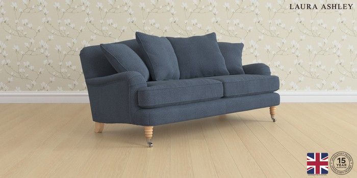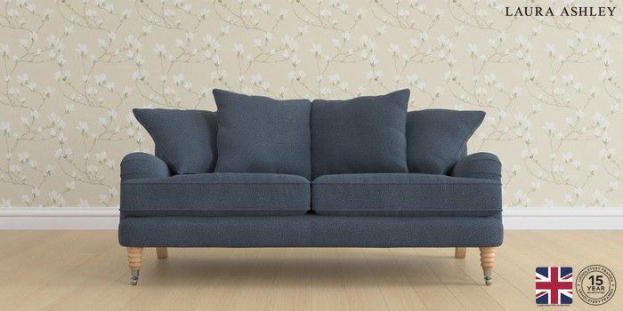 6.12.1 Buy Lynden Scatter Back by Laura Ashley 3 Seater Small Sofa Lundar Chenille Navy Blue Ornate Chrome Castor - Light Oak from the Next UK online shop Click here to use our accessible website