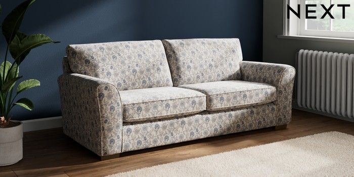 7.3.1 Buy Michigan II 3 Seater Small Sofa Relaxed Linen Look Print Woodblock Floral Blue Slim Block - Mid from the Next UK online shop