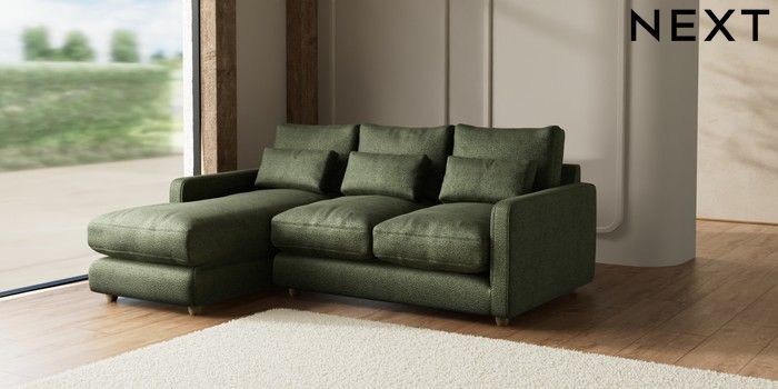 7.2.6 Buy N Premium Farndon Grand Relaxed Sit Medium Sofa Chaise - Left Hand Boucle Chenille Dark Moss Green Wooden Glide - Light from the Next UK online shop Click here to use our accessible website