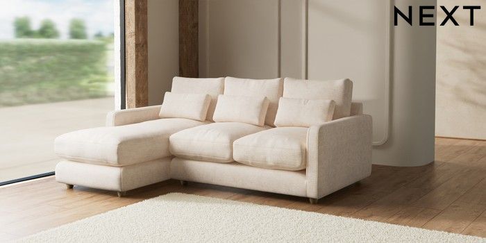 7.2.6 Buy N Premium Farndon Grand Relaxed Sit Medium Sofa Chaise - Left Hand Boucle Chenille Oyster Wooden Glide - Light from the Next UK online shop Click here to use our accessible website