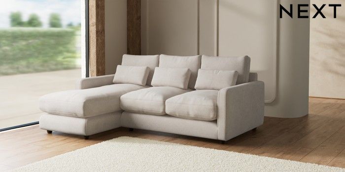 7.2.6 Buy N Premium Farndon Grand Relaxed Sit Medium Sofa Chaise - Left Hand Chunky Chenille Oyster Wooden Glide - Mid from the Next UK online shop Click here to use our accessible website