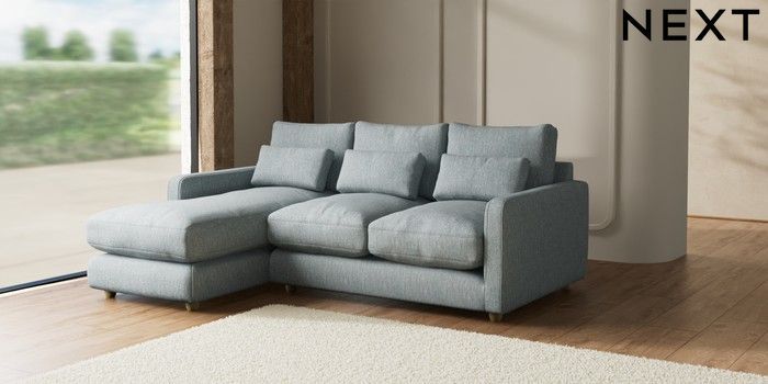 7.2.6 Buy N Premium Farndon Grand Relaxed Sit Medium Sofa Chaise - Left Hand Chunky Weave Mid Blue Wooden Glide - Light from the Next UK online shop Click here to use our accessible website