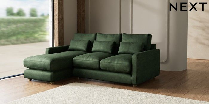 7.2.6 Buy N Premium Farndon Grand Relaxed Sit Medium Sofa Chaise - Left Hand Luxe Chenille Dark Green Wooden Glide - Light from the Next UK online shop Click here to use our accessible website