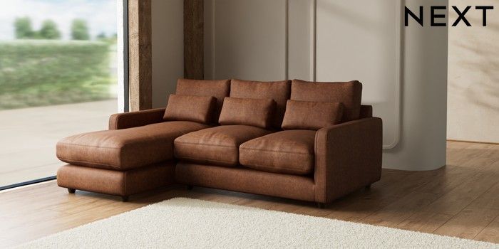 7.2.6 Buy N Premium Farndon Grand Relaxed Sit Medium Sofa Chaise - Left Hand Monza Faux Leather Easy Clean Chestnut Brown Wooden Glide - Mid from the Next UK online shop Click here to use our accessible website