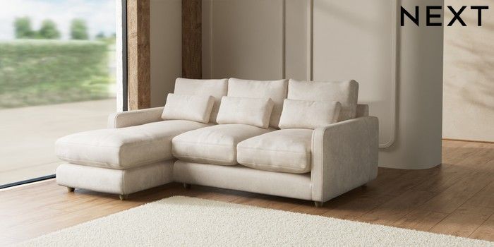 7.2.6 Buy N Premium Farndon Grand Relaxed Sit Medium Sofa Chaise - Left Hand Plush Chenille Oyster Wooden Glide - Light from the Next UK online shop Click here to use our accessible website